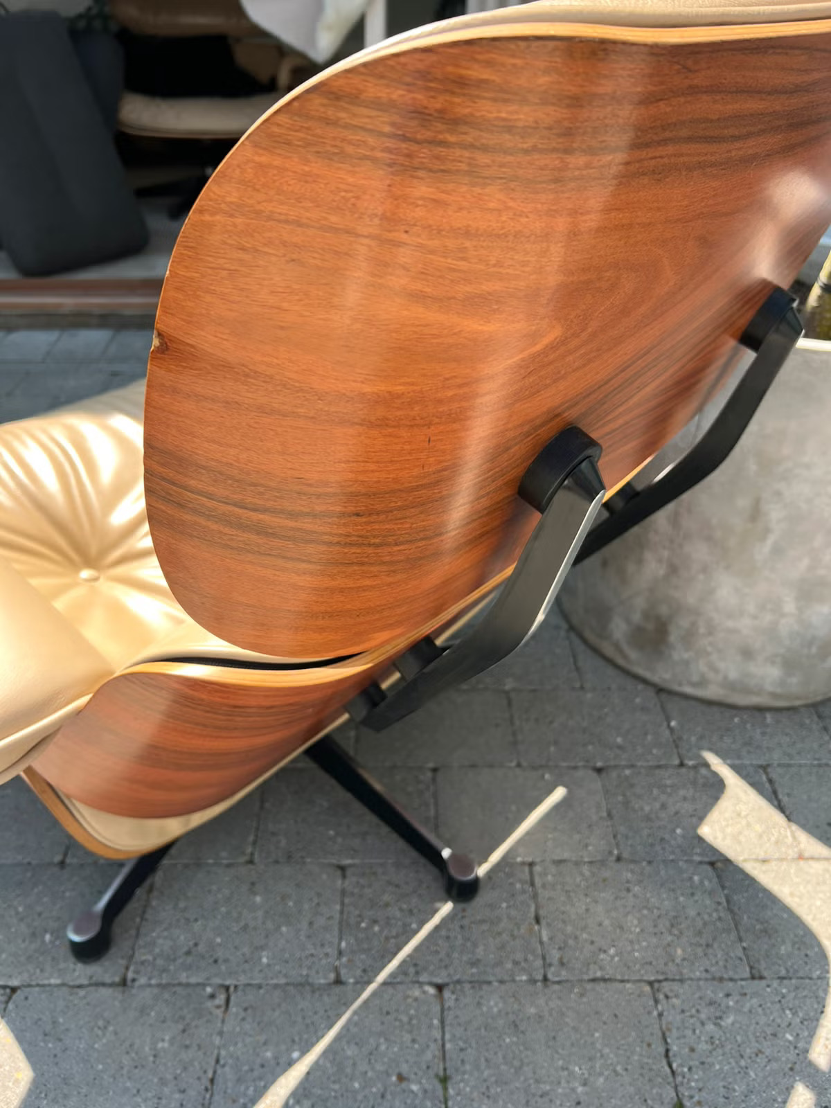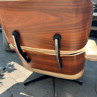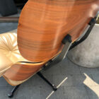 Material och Karaktär Denna specifika fåtölj är utförd i en oerhört elegant och sofistikerad färgkombination. Det mjuka, högkvalitativa lädret har en vacker beige/ljus ton som ger ett ljust och inbjudande intryck. Lädret bär på en fantastisk patina och naturliga veck som vittnar om dess äkthet och ålder – precis som en vintage Eames ska se ut.